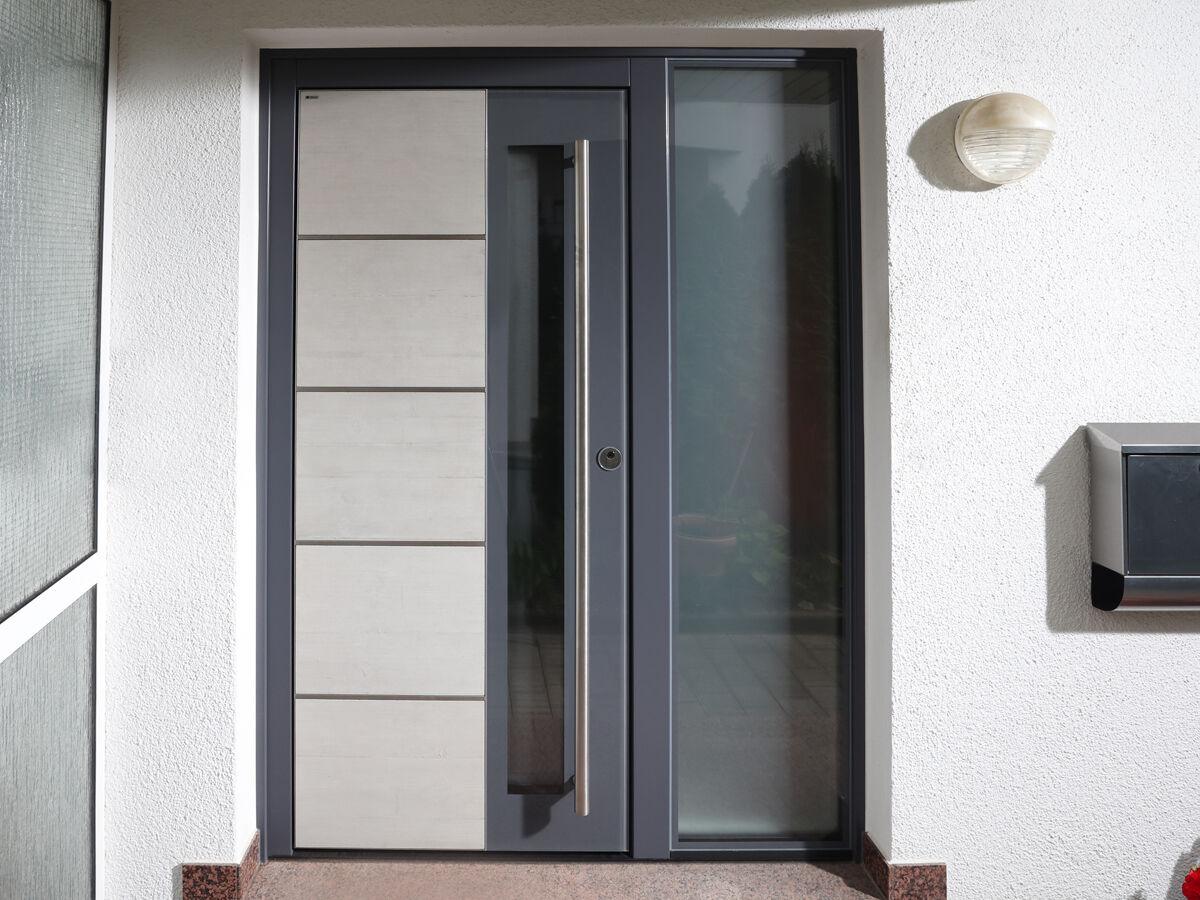 Moderne Hauseingangstüre mit Keramik anthrazit. Flächenbündiges Stufenglas in Rauchglasoptik (Parsolgrau)