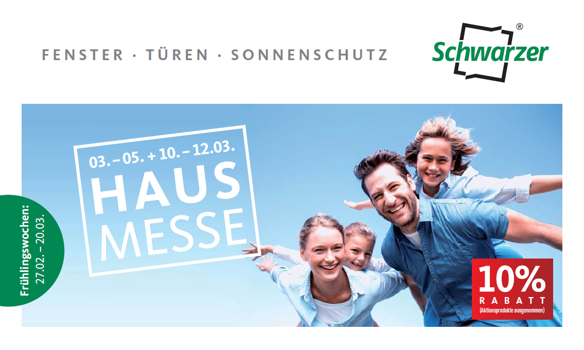 Die o.g Messeaktionen, sowie die 10 % Messerabatt gelten im Rahmen unserer Frühlingswochen (27.02. - 20.03.2023)Wir zeigen Ihnen, wie Sie mit wärmedämmenden Fenstern & Rollladensystem Heizkosten einsparen können und wie hochwertige Haustüren den Wert Ihrer Immobilie nachhaltig nicht nur erhalten, sondern auch steigern können. Unsere Experten beraten Sie gerne zu Ihren ganz persönlichen Modernisierungsvorhaben und können Ihnen in unserer 320 m² großen Ausstellung alle Fragen anhand lebensecht dargestellten Situationen ausführlich beantworten.