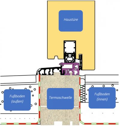 Bei dieser Aktion profitieren Sie von unserer besonderen Montagetechnik. Denn was nützt es, sich ein hoch-wärmedämmendes Haustürenelement einzubauen, wenn die Kälte ungehindert über die durchgehende Bodenplatte unter der Türe hindurchwandern kann. Hier kommt unsere Termoschwelle zum Einsatz, wobei der Rohfußboden durchtrennt wird und der entfernte Ausschnitt durch ein Isolierendes Element inkl. Abdichtungen nach innen und nach außen ersetzt wird, was somit den Kältefluss unterbricht. Und so sieht das ganze dann aus (Skizze):