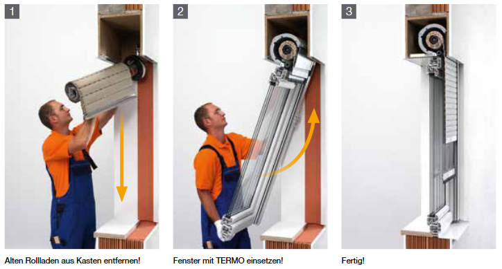 Ihr Vorteil, bei dieser Aktion, ist jedoch weit mehr als "nur" der finanzielle Faktor. Tatsächlich ist es eine Win-Win-Situation für Sie: Denn in den meisten Fällen, wird im Zuge einer Fenstersanierung gleichermaßen auch das Rollladensystem erneuert. Dies kann auf unterschiedlichste Art und Weise geschehen. Aber mit unserer Aktion, haben Sie das All-in-One Premiumpaket, mit dem Sie in Sachen Wärmedämmung alles abdecken. Angefangen vom Isolierten Rollladendeckel, die gedämmte Gurtführung, sowie das komplett isolierte und umschlossene Rollladenelement, sodass weder warme Luft nach außen, noch kalte Luft nach innen dringen kann und durch das in sich geschlossene System gleichzeitig Ihren Schallschutz deutlich verbessert. Gleichermaßen werden sämtliche mechanischen & beweglichen Teile wie die Achslager und die Rollladenachse selbst ersetzt. Somit bleiben keine alten Teile im Kasten zurück. Getreu dem Motto: "Aus alt, mach neu!" Und so einfach gehts: